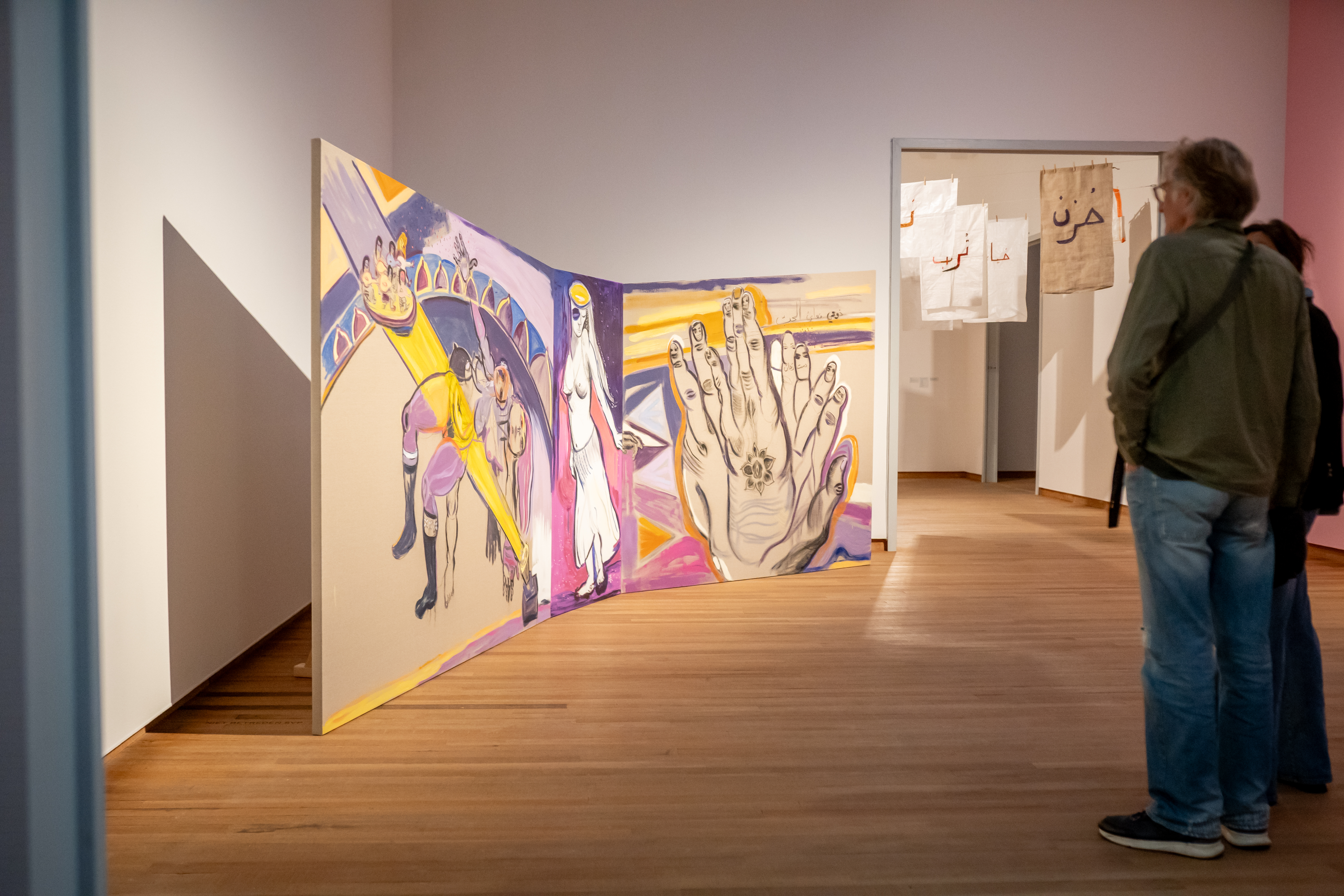 Mounira Al Solh's art combines art traditions from the Middle East and the Netherlands. The large three-dimensional triptych Flying, clapping, grooving, tasting love shows the musical impact on the soul. The form of the painting is reminiscent of the work of Dutch painter René Daniëls, several of whose works are included in the Bonnefanten Collection.