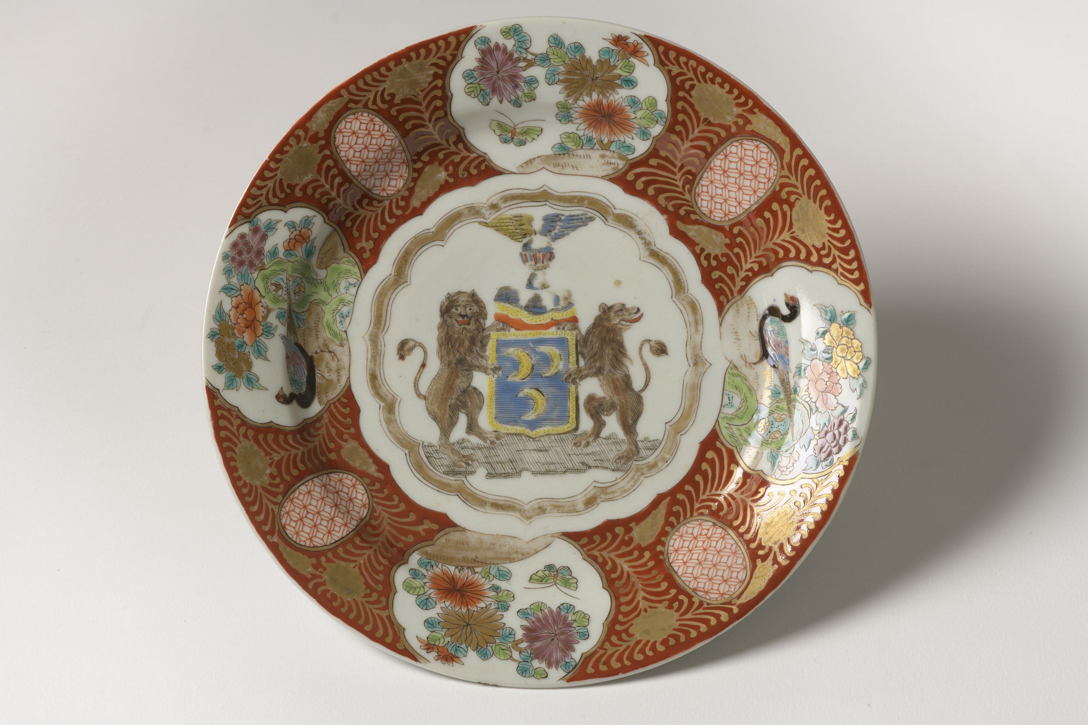 Title | Bord, Chine de Commande waarop twee leeuwen een wapen vasthouden |