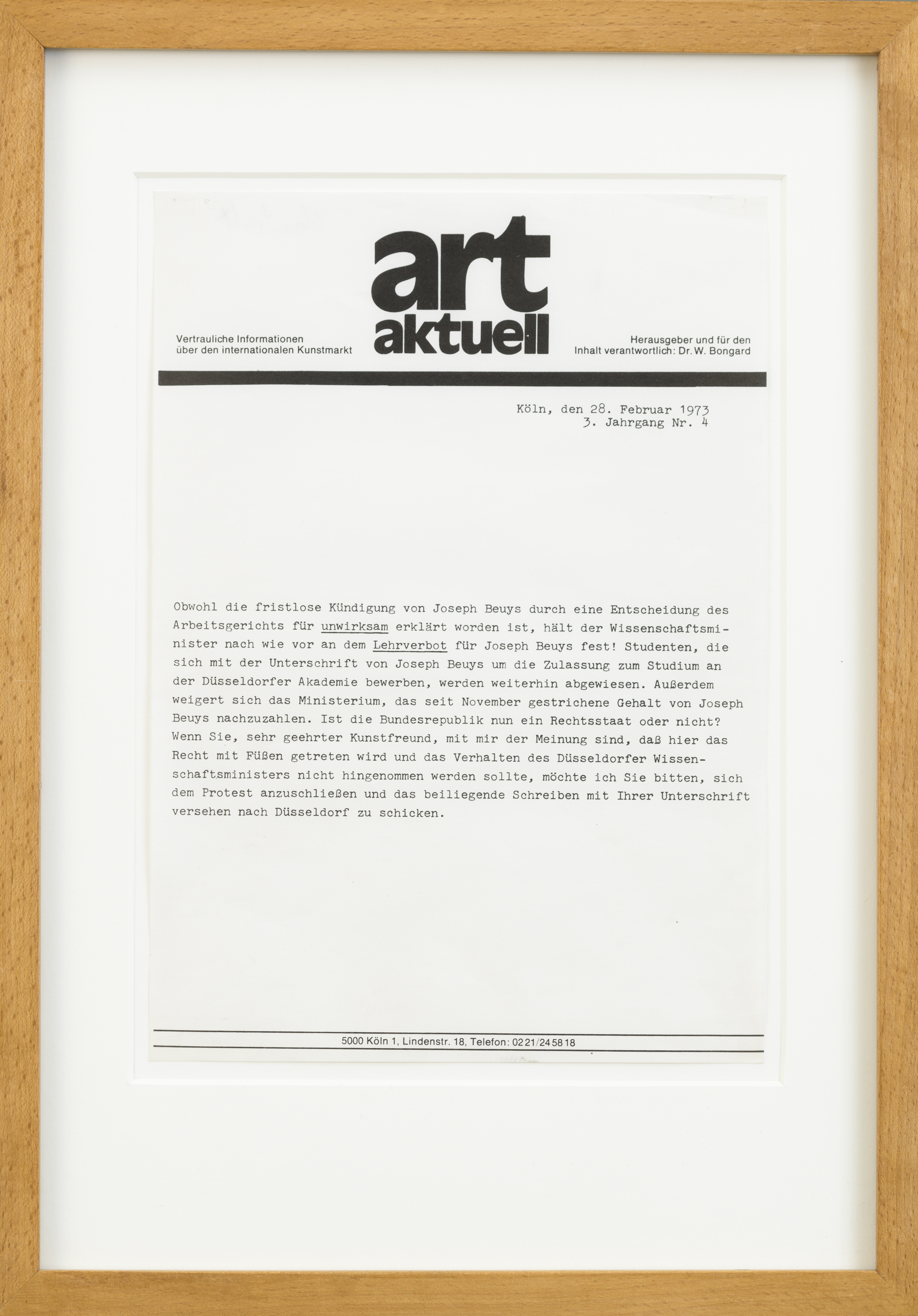 Title | Pamflet: Bongard, W., oproep tegen ontslag Beuys in: Art Aktuell, 3e jaargang, no 4, 28 feb 1973, 1 blz. Beiliegend Schreiben: onduidelijk welk dat is, ontbreekt? |