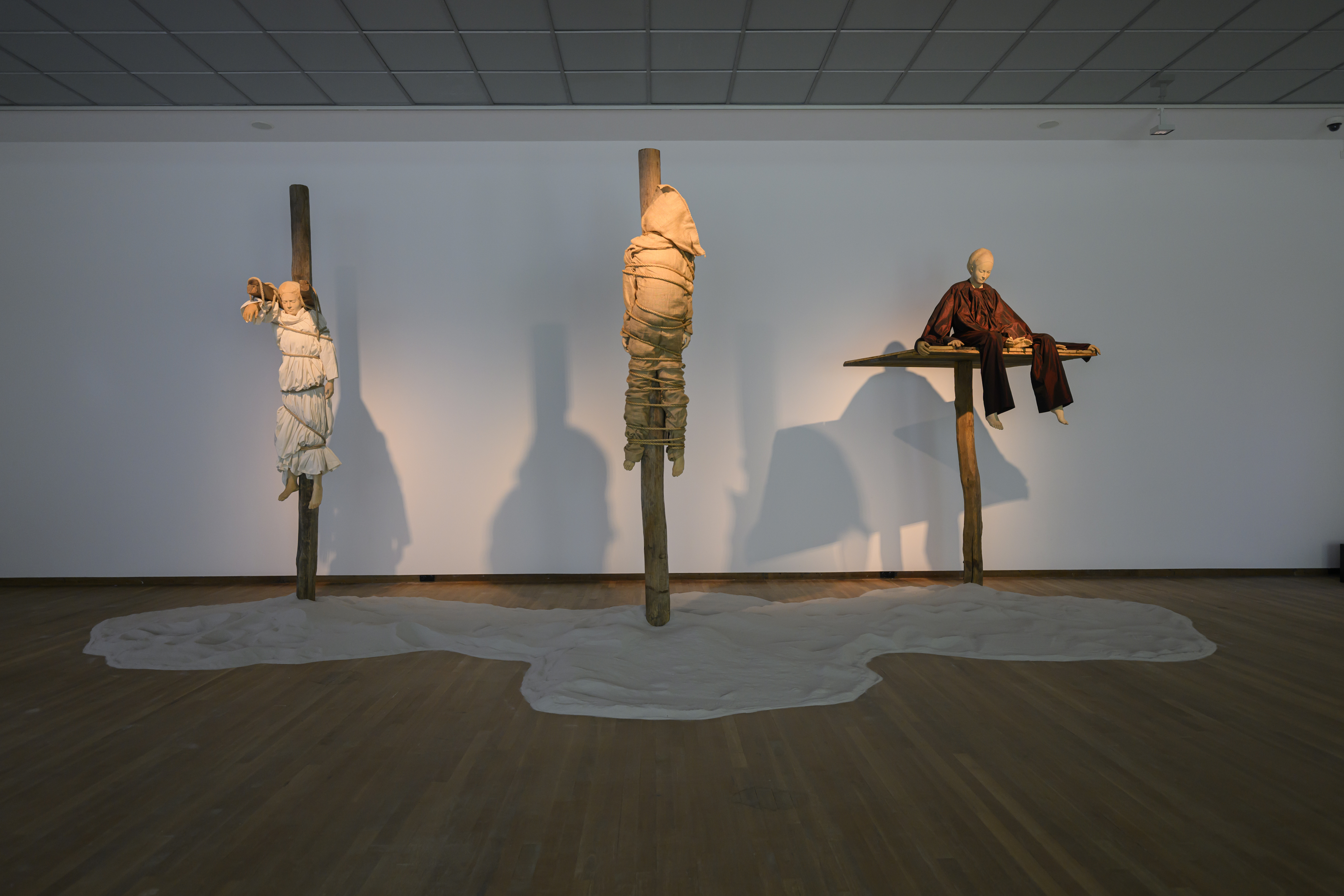 Afmetingen | Lengte: 185 cm (hangende figuur) Breedte: 45 cm (hangende figuur) Diepte: 86 cm (hangende figuur) Hoogte: 380 cm (hangende figuur) Lengte: 220 cm (gebonden figuur) Breedte: 57 cm (gebonden figuur) Diepte: 43 cm (gebonden figuur) Hoogte: 420 cm (gebonden figuur) Diepte: 106 cm (zesarmig figuur) Hoogte: 230 cm (zesarmig figuur) Lengte: 171 cm (zesarmig figuur) Breedte: 135 cm (zesarmig figuur) Tekst: zaalvullend, totale afmeting installatie variabel: 14 x 5,2 x 3,8 meter |
